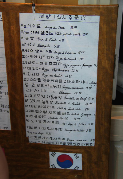 그런데 이게 뭡니까? 한 레스토랑 앞의 메뉴판을 한글로 써 놓았군요. ㅎㅎ